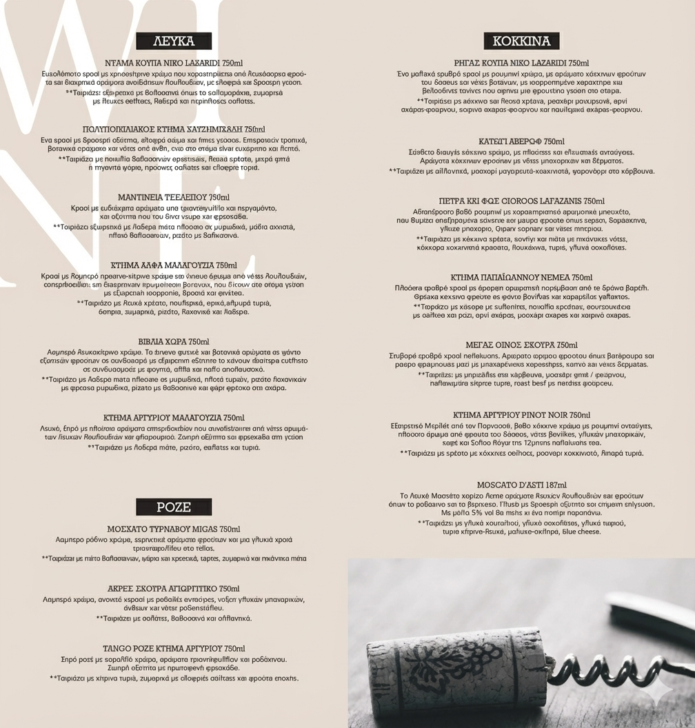 Τις γεύσεις αυτές συνοδεύει μια προσεκτικά επιλεγμένη κάβα με κορυφαίες ετικέτες από τον ελληνικό και διεθνή αμπελώνα. Στη λίστα μας θα βρείτε εξαιρετικούς λευκούς οίνους όπως η Μαλαγουζιά του Κτήματος Άλφα, η Μαντίνεια Τσελεπού και η Βιβλία Χώρα, αλλά και σπουδαία κόκκινα κρασιά όπως η Νεμέα του Κτήματος Παπαϊωάννου, ο Μέγας Οίνος του Σκούρα και το Pinot Noir του Κτήματος Αργυρίου. Για όσους προτιμούν κάτι πιο ανάλαφρο, διαθέτουμε δροσερές ροζέ επιλογές όπως το Tango του Κτήματος Αργυρίου, καθώς και το κλασικό γλυκό Moscato D’Asti.